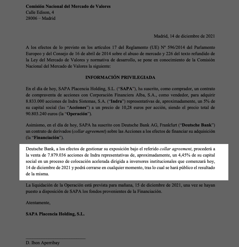 Sin embargo, la ingeniería financiera fue la pieza fundamental de esta operación, ya que SAPA se compró las acciones merced a un galimatías financiero cortesía de Deutsche Bank. El mismo día que comunica la adquisición de las acciones de Indra, SAPA suscribió con Detusche Bank AG, Frankfurt, un contrato de derivados sobre las acciones de Indra para tratar de financiar la operación. Para ello, el banco alemán vendió 7,8 millones de acciones de Indra (4,45% del capital) a inversores institucionales. Operación con la que financió la de Sapa. Así se recoge en una información privilegiada de la CNMV