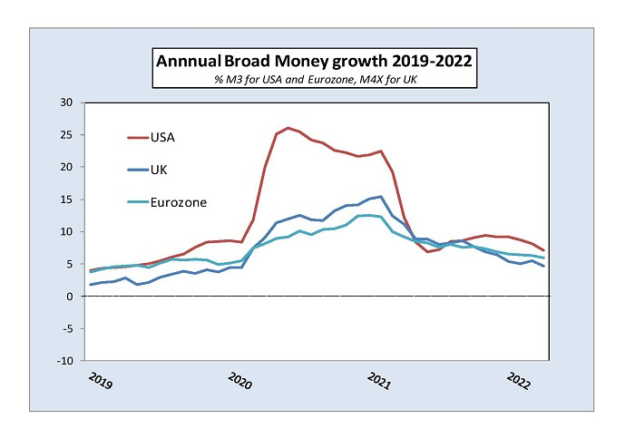 Si tomamos como referencia el último informe del Instituto Internacional de Investigaciones Monetarias de la Universidad de Buckingham y repasamos los tres últimos años, podemos ver que el aumento de la masa monetaria se aceleró con fuerza tras el estallido de la pandemia del coronavirus, llegando a alcanzarse tasas del 20-25% en Estados Unidos durante buena parte de 2020. En la Eurozona, el ritmo de aumento fue menos acusado, pero se movió también en cotas cercanas al 10%. Algo similar ocurrió en Reino Unido, cuya política monetaria ha sido similar a la implementada desde Frankfurt.