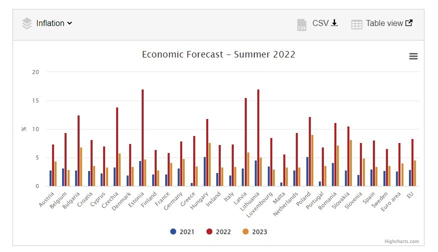 Pero el dato más demoledor de las nuevas cuentas de Bruselas es el de la inflación. El Ejecutivo comunitario anticipa una subida de precios hasta el 8,1% para el conjunto de este año, mientras que hace apenas dos meses estimaba un 6,3%, que ya es suficientemente grave.