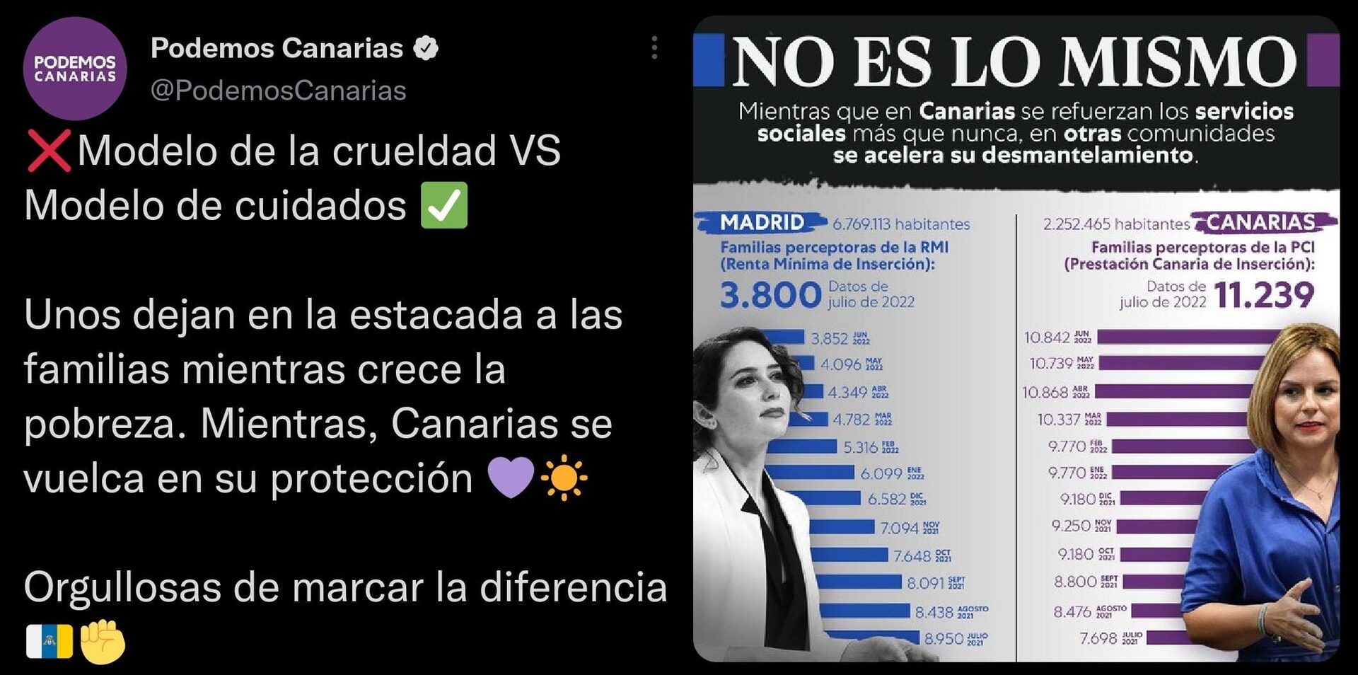 El partido Unidas Podemos Canarias ha escrito un tweet en su cuenta oficial comparando la gestión de Isabel Díaz Ayuso en la Comunidad de Madrid y la del PSOE -apoyado por Podemos- en Canarias.