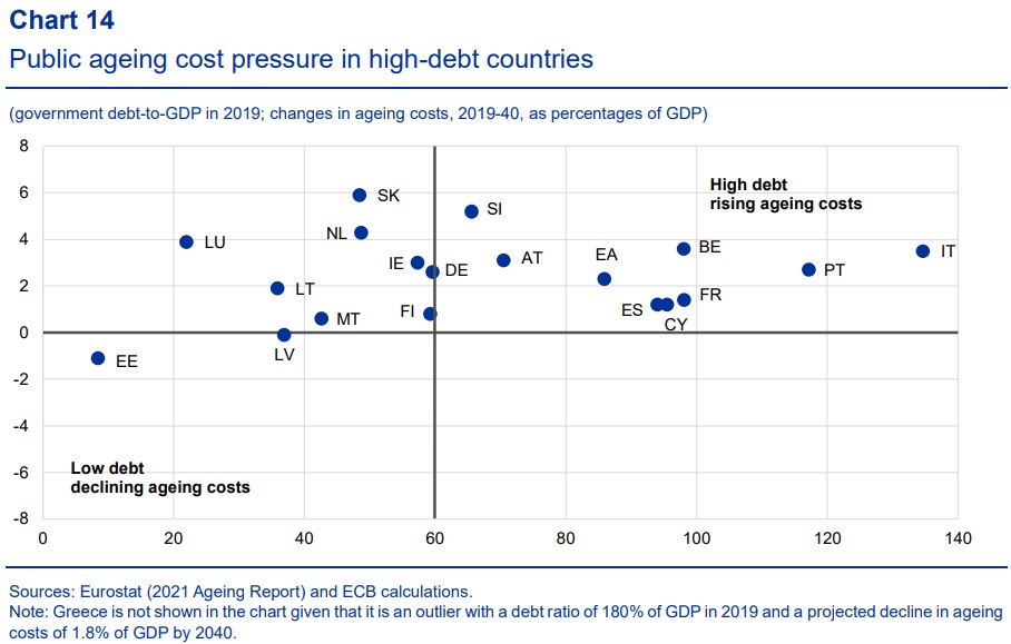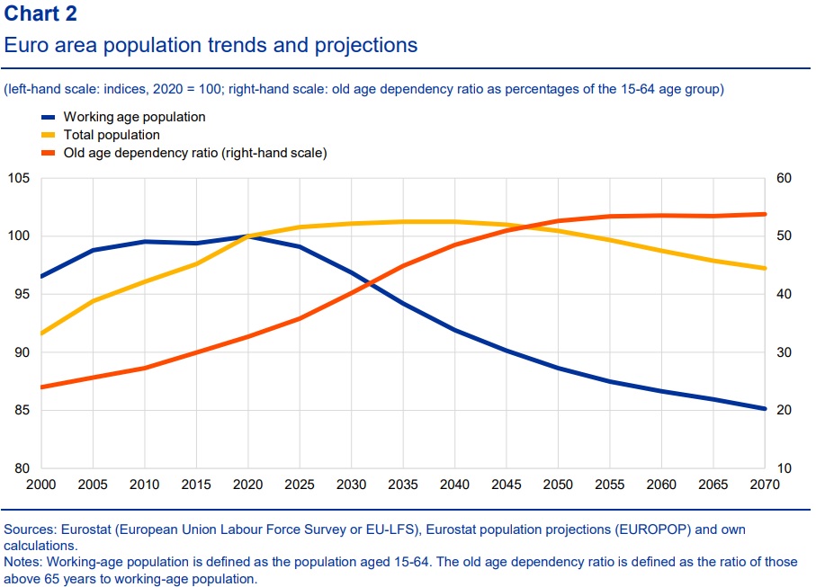 "La Eurozona ha entrado en una era de cambios demográficos drásticos (…). La disminución de las tasas de natalidad y el aumento de la esperanza de vida están provocando un aumento en el número de jubilados medido en relación con el número de trabajadores. Durante la próxima década y media, esta tendencia se amplificará, a medida que la generación del baby boom se jubile y la cohorte de trabajadores en activo se reduzca con más fuerza (…). Se prevé que la tasa de dependencia de las personas mayores alcance casi el 54 % en 2070 (…). Si no se aborda esta cuestión, el envejecimiento progresivo de la población supondrá una carga para las finanzas públicas en la zona del euro, dado el papel relativamente importante de los sistemas de pensiones y de atención de la salud, financiados esencialmente con fondos públicos. Los desafíos de sostenibilidad de la deuda que pueden surgir se derivarían del aumento del gasto público relacionado con el envejecimiento, cuestión que será particularmente preocupante en los países con deudas más altas".