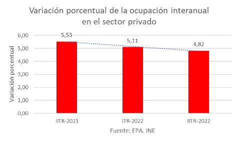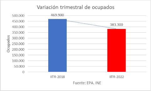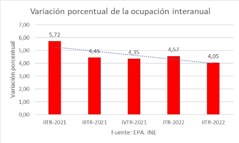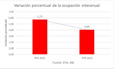 En tasa interanual se crean 796.300 empleos debido al efecto estadístico al comparar con el IITR-2021, donde todavía operaban muchas restricciones derivadas de la pandemia, con lo que no es comparable. Ahora, si observamos el crecimiento porcentual, el dato interanual de ocupados se queda por detrás del dato del año pasado: