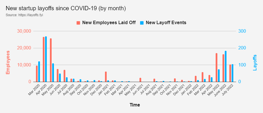 Por su parte, la plataforma Layoffs.fyi rebaja la cifra de despidos a 43.000 desde mayo de este año. En cualquier caso, ambas fuentes coinciden en la fuerte subida de los despidos a partir de febrero de 2022, y de manera mucho más agresiva desde el mes de mayo. Se trata, por tanto, del mayor repunte desde el estallido de la pandemia en 2020. En aquel entonces, los despidos se centraron en startups dedicadas a trasportes, viajes o al sector minorista, mientras que ahora se expanden a muchas otras ramas.