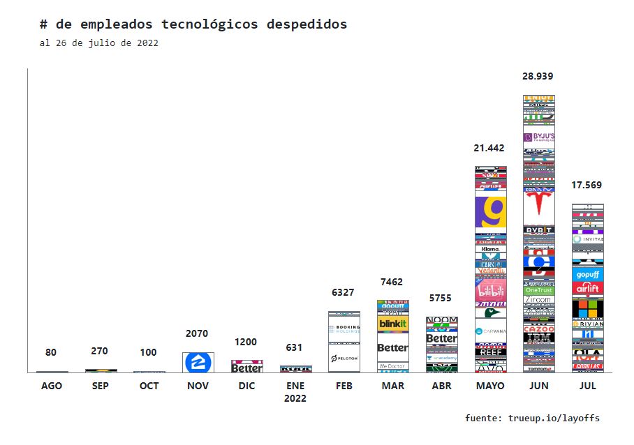De esta forma, si atendemos a las estadísticas recopiladas por el portal Trueup.io, que hace un seguimiento de los despidos en startups y empresas tecnológicas, se habrían producido más de 68.000 destituciones desde el mes de mayo. Como puede observarse en el siguiente gráfico, algunos de los despidos más relevantes han sido los de la compañía de delivery Getir, los de Tesla, así como los correspondientes al distribuidor de vehículos Carvana, los de Microsoft o los del exchange de criptomonedas Coinbase, entre otros.