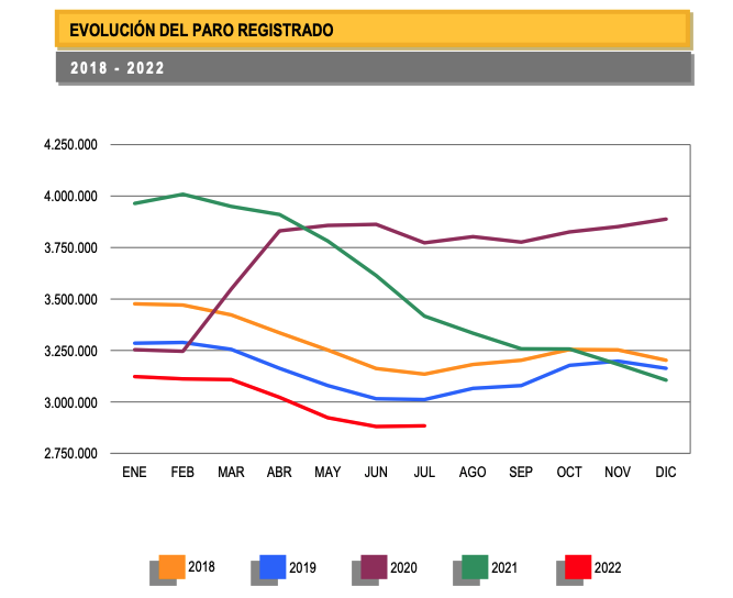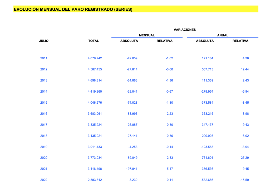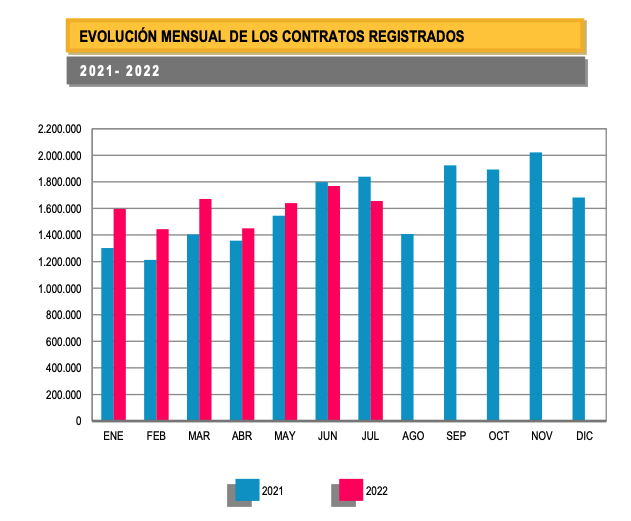 No sólo eso, en los datos de Empleo la estadística refleja un cambio de tendencia llamativo en el mes de julio, en el que cae respecto al año anterior el número de contratos registrados. El número total de contratos en el pasado mes de julio fue de 1.655.515, una bajada del 6,41% (113.473) respecto al mismo mes de 2021.