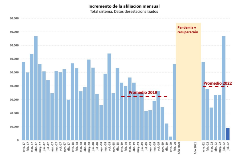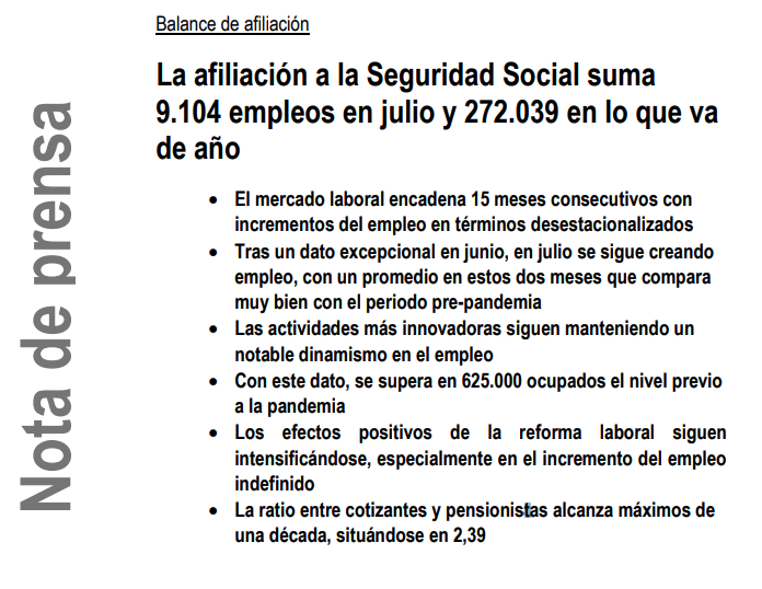 No obstante, y pese al fuerte esfuerzo del departamento de Seguridad Social por maquillar el preocupante dato de julio, las estadísticas que reflejan la nota de prensa evidencian que, incluso en términos desestacionalizados, el dato de julio es extraordinariamente preocupante.