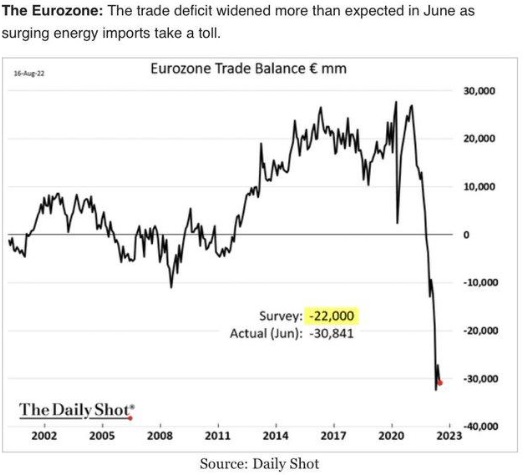 En segundo lugar, porque la demanda doméstica está gripada por la inflación y la internacional es cada vez más cara como consecuencia de la debilidad del euro (lean). Este factor, junto con la evolución exponencial de los precios de la energía están llevando a la UE, y muy especialmente a Alemania, a algo no visto desde hace décadas: El déficit comercial. La diferencia entre el valor de las exportaciones y las importaciones de bienes (especialmente energéticos) cada vez es mayor, no se compensa por la balanza de servicios y, por lo tanto, se genera un déficit por cuenta corriente que hay que financiar a través de deuda externa.