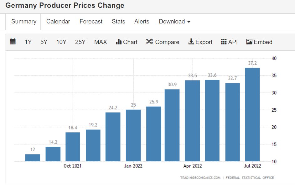Y, por último, a la debilidad económica estructural y a la crisis energética en Europa tenemos que añadir el enorme problema que ya supone la inflación. El crecimiento del nivel general de precios ya asciende al 8,9% y no encuentra techo. Preocupa sobre todo la situación en Alemania, donde la inflación es del 7,5% y, a pesar de la ligera estabilización durante los últimos meses, el incremento de costes energéticos está llevando a que los precios industriales continúen disparados y con una evolución al alza: El último dato de julio avanza un incremento del 37,2%, frente al 32,7% de junio y al 12% de hace un año. Si había algún síntoma de estabilización en los últimos 4 meses, se ha desvanecido.