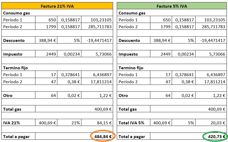 Si hacemos el cálculo con el precio a 0,16 euros (0,158817 para ser exactos), la suma ascendería en esta ocasión a 484,84 euros. Y, aunque finalmente se pudiera beneficiar del IVA al 5% durante todo el periodo de facturación, la cifra se quedaría en 420,73 euros. En todo caso, un auténtico sablazo del que pocos usuarios son conscientes y que pasará factura a todos los hogares españoles.