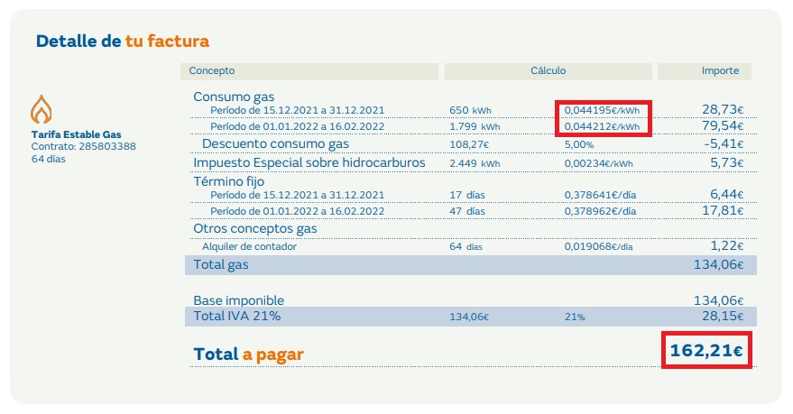 Tal y como se puede comprobar en los recibos, con el gas a 0,04 euros el kWh, su factura ascendió por aquel entonces a 162,21 euros.