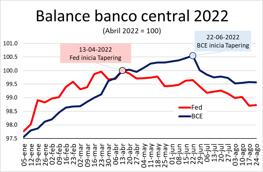 En nuestro caso, tanto la Fed como el BCE han empezado a hacer política monetaria no convencional restrictiva, es decir, los dos bancos centrales ya se encuentran en pleno Tapering. Sin embargo, una vez más, aquí el Banco Central Europeo va tarde, y es que ha empezado a hacer ventas de bonos en el mercado más de dos meses más tarde que la Fed.
