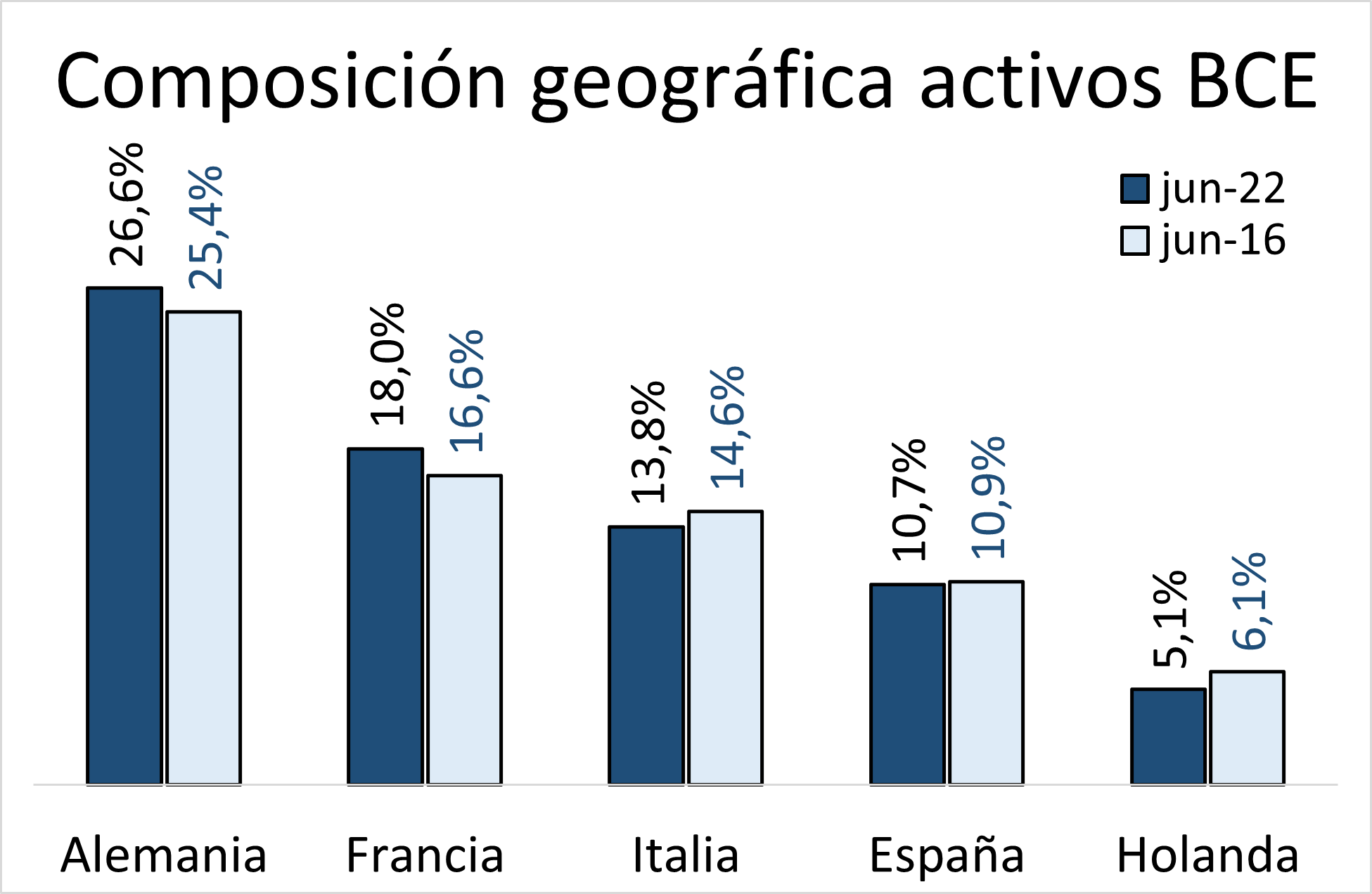 Como se ve en el gráfico 4, la composición geográfica de los activos del BCE apenas ha cambiado en el tiempo a pesar de las enormes compras que ha estado haciendo en el mercado de deuda en los últimos años. Esta composición geográfica de activos del BCE se asemeja mucho al capital invertido por cada país en el BCE. Podríamos decir que la política monetaria del BCE era, hasta ahora al menos, simétrica con respecto a la compra de deuda de diferentes países.