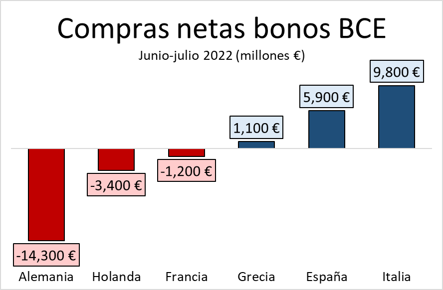 La venta de bonos alemanes y otros países sólidos provoca que el tipo de interés que paga Alemania por su deuda incremente. Por su parte, la compra de bonos de Italia y de otros países financieramente irresponsables provoca que el tipo de interés que paga Italia por su deuda caiga. Es decir, el BCE está, ahora sí, utilizando el mecanismo monetario para redistribuir riesgo desde Italia y España hacia Alemania y Holanda.