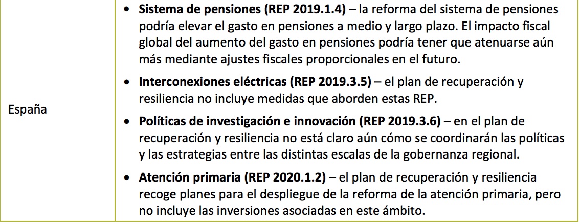 "La reforma del sistema de pensiones podría elevar el gasto en pensiones a medio y largo plazo. El impacto fiscal global del aumento del gasto en pensiones podría tener que atenuarse aún más mediante ajustes fiscales proporcionales en el futuro" reza el texto. Además, ni Alemania, ni Francia, ni Italia, ni España abordaron "elementos relacionados con la sostenibilidad de las pensiones" como recomendaba Bruselas.