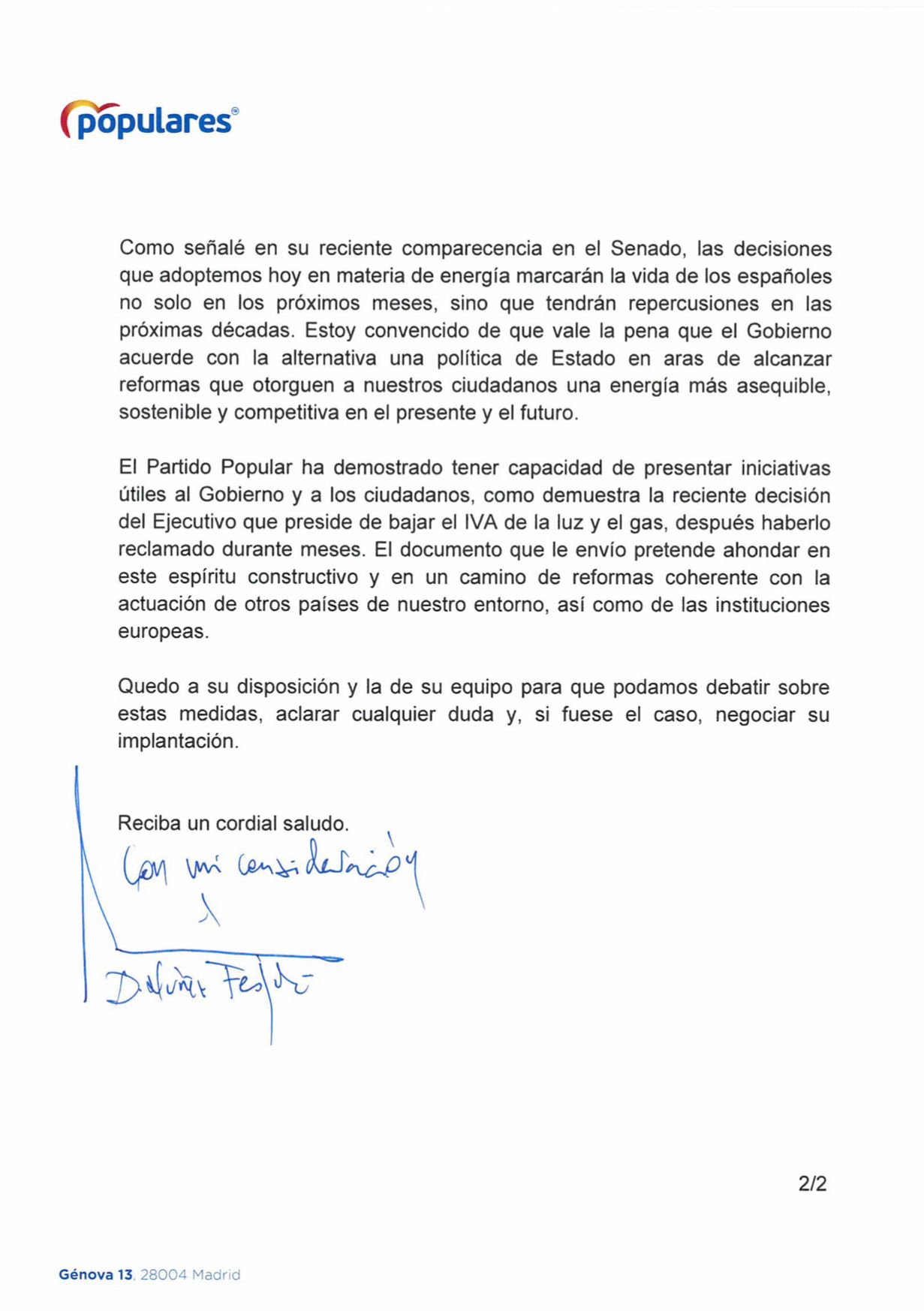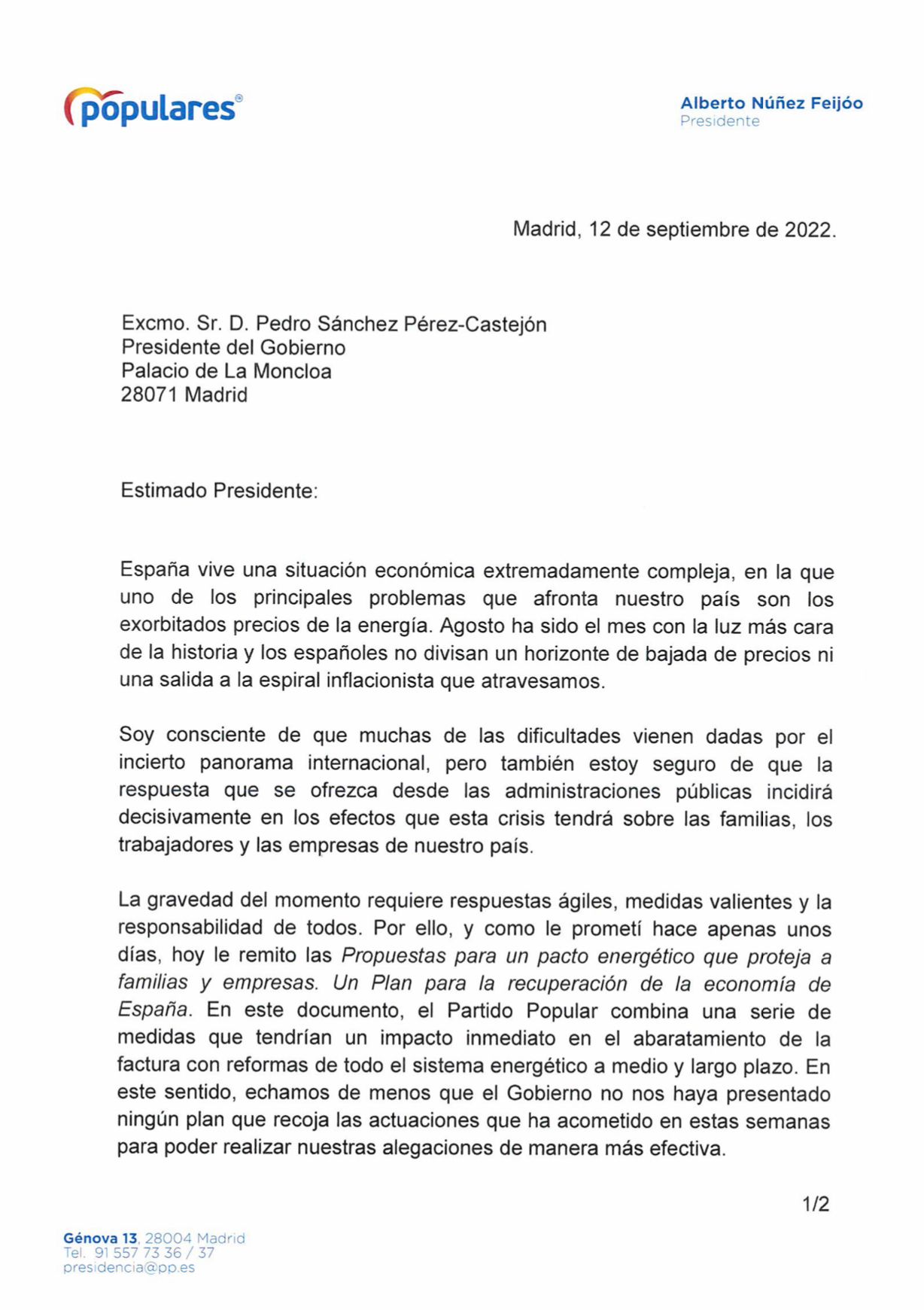 El documento de medidas va acompañado por una carta enviada por el líder del PP, Alberto Núñez Feijóo, a Pedro Sánchez en la que le pide "respuestas ágiles y medidas valientes" y le tiende la mano para hablar de ellas: