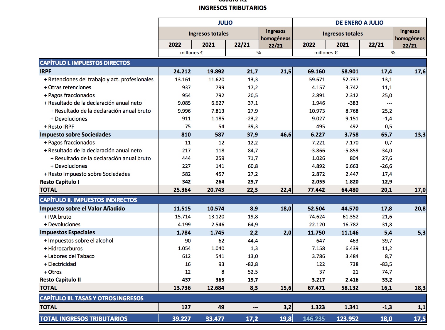 Así, en plena tormenta inflacionista, Hacienda está haciendo una suculenta caja gracias al tributos como el IRPF o el IVA. La voracidad del departamento que dirige María Jesús Montero explica que las arcas del Estado hayan ingresado hasta el mes de julio la friolera de 146.235 millones de euros, un 18% más que en el mismo periodo del año anterior. Todo un récord recaudatorio para Montero.