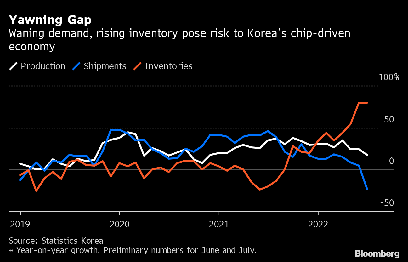 Algunos signos de esta problemática podemos encontrarlos en los datos de producción de Corea del Sur, que en julio registró la primera caída de envíos de microchips desde hace casi 3 años. A la par, como vemos en el siguiente gráfico, los inventarios de los fabricantes se disparan un 80% respecto al año pasado, mientras que la producción se desacelera progresivamente.