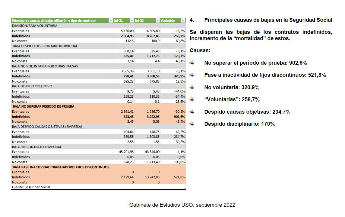 Los contratos indefinidos a jornada completa fueron el 43% del total en agosto de 2022, 20 puntos menos que un año antes. Los contratos indefinidos a tiempo parcial se han disparado un 300% en el último año. Y se ha disparado un 900% la rescisión de contratos "indefinidos" que no superan el período de prueba y un 500% los fijos discontinuos que pasan a la inactividad, según el sindicato USO.