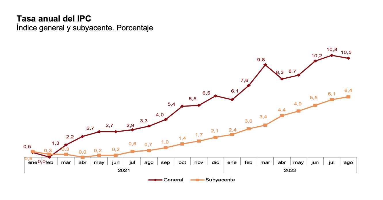 Peor aún: si ignoramos el IPC general y nos fijamos en el desempeño de la inflación subyacente, cuyo cálculo deja a un lado los productos energéticos y alimenticios por su mayor volatilidad, encontramos que su desempeño es igualmente preocupante, puesto que se ha incrementado un 6,4% en agosto y encadena más de doce meses de subidas ininterrumpidas.