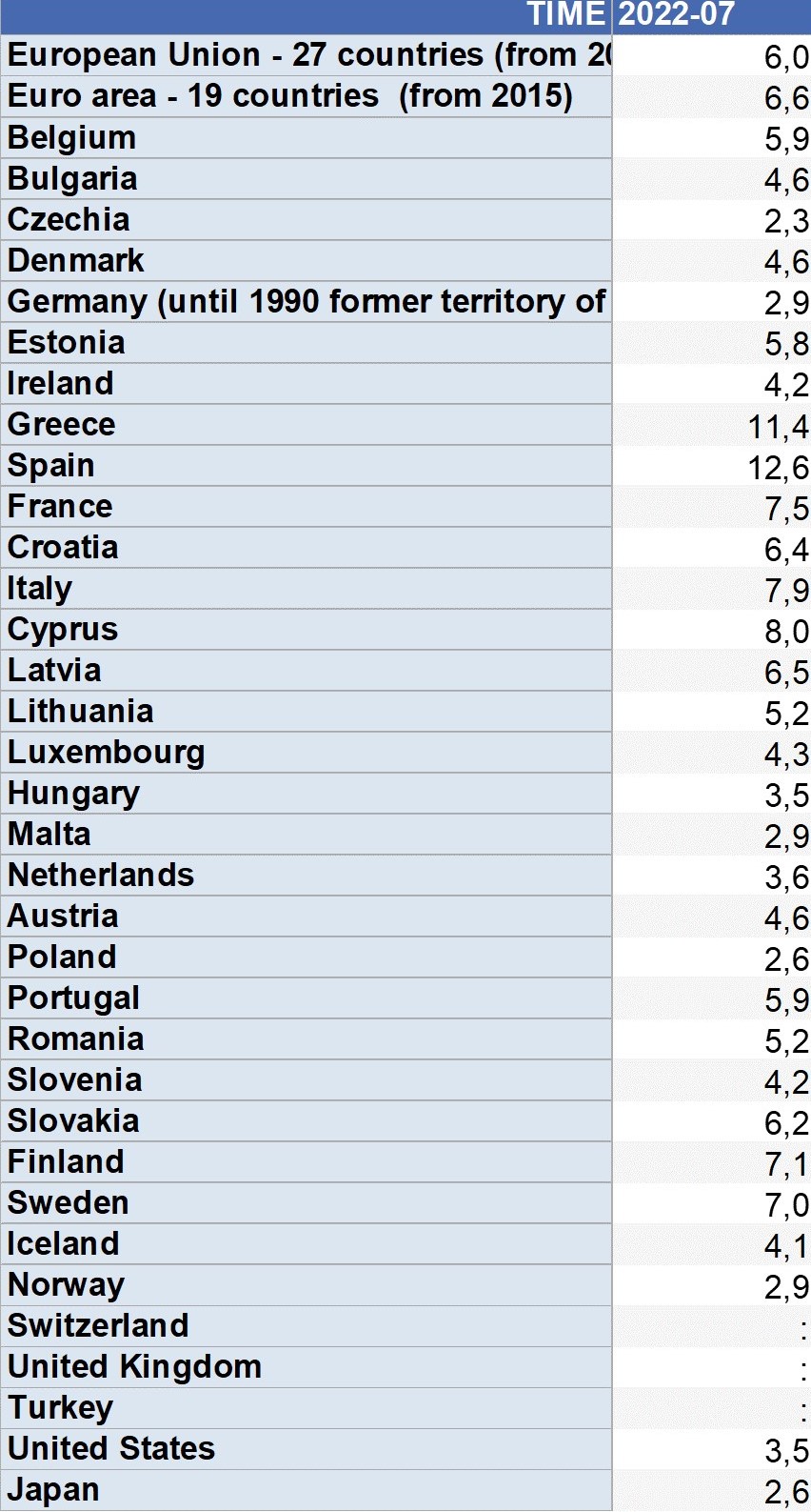 Eso hace que España tenga en julio de 2022 la tasa de paro más alta de toda la UE, un 12,2%, el doble que la UE (6%), casi el doble que la eurozona (6,6%), casi el triple que Irlanda (4,2%), más del cuádruple que Alemania (2,9%), casi 5 puntos más que Francia (7,5%) ó 4,3 puntos más que Italia.