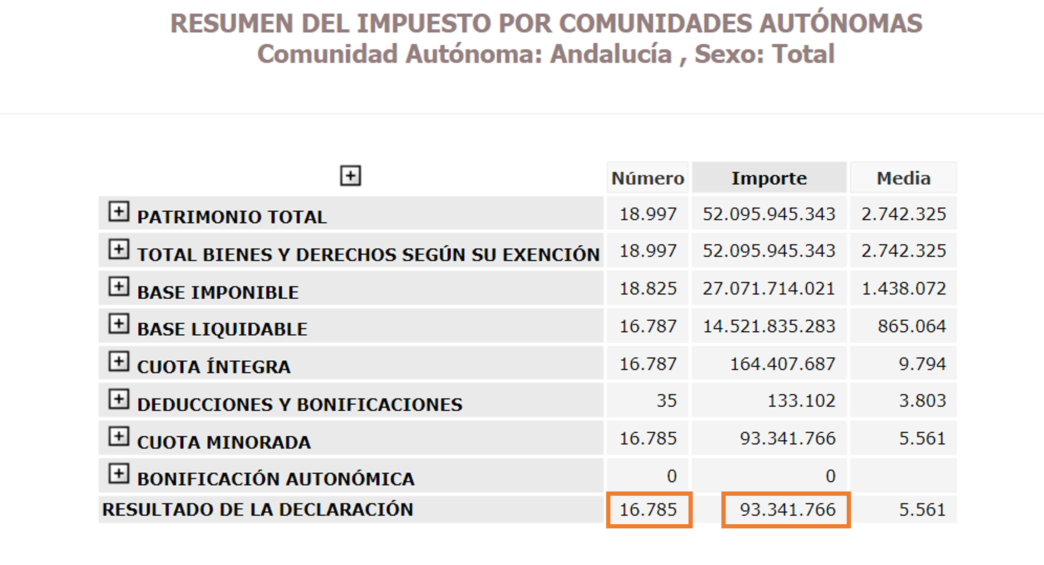 El Gobierno de Andalucía ha defendido que la supresión de Patrimonio no tendrá apenas impacto negativo en las cuentas de la administración autonómica porque solo supone un 0,6% de lo que se recauda. Concretamente, se trata de un tributo que apenas logró recaudar 93,3 millones de euros en el año 2020, según los datos de la Agencia Tributaria. Una cifra que contrasta con el total de 38,7 mil millones que la Junta gastó ese mismo año, o los 49 mil millones que desembolsó en 2021. De esta forma, los 16.785 ciudadanos que pagaban este impuesto dejarán de hacerlo.