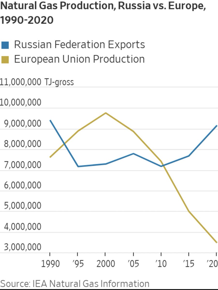 Solo han pasado tres lustros desde entonces, pero el desequilibrio ya es tan importante que Rusia exporta ahora tres veces más gas natural del que producen los países de la Unión Europea. Es difícil entender semejante evolución sin tomar en consideración la influencia que ha jugado Rusia en el debate energético europeo y que ha tenido como resultado el apuntalamiento de la "agenda climática" con la que la producción de gas natural ha terminado duramente golpeada.