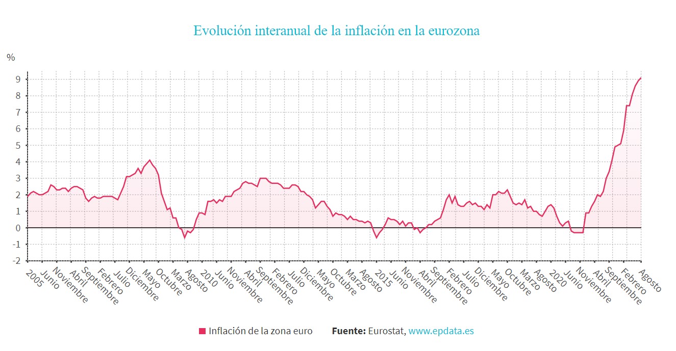 Según los últimos datos del mes de agosto, los precios se dispararon en Europa hasta el récord del 9,1%, lo que está erosionando sobremanera la riqueza de los ciudadanos y lastrando la actividad de las empresas. "Las presiones sobre los precios se están propagando cada vez a más sectores" alerta el BCE en su último Boletín Económico.