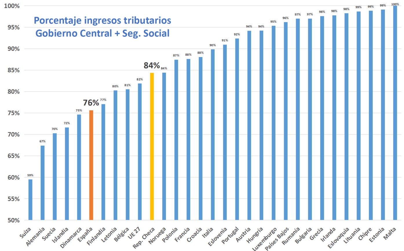 Podríamos discutir mucho sobre cómo hacer la clasificación. Eurostat subdivide entre cuatro categorías: Gobierno Central - Regional - Municipal - Seguridad Social. Nosotros hemos agrupado el porcentaje de los ingresos tributarios que recaudan el Gobierno central y la Seguridad Social por un lado, frente a los que tienen las subdivisiones administrativas territoriales.