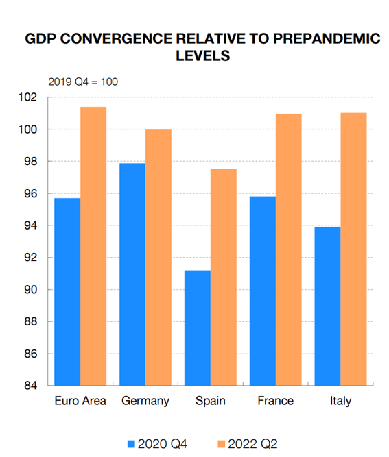 En estas circunstancias, mientras que Francia, Alemania, Italia y la media de la eurozona han alcanzado o superado el nivel de PIB real previo a la pandemia, España está todavía más de dos puntos por debajo, pese a que el nivel de empleo sí se ha alcanzado, lo cual indica que se está deteriorando la productividad en España.