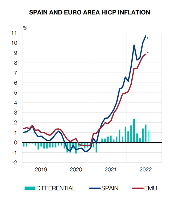 Asimismo, el diferencial de inflación de España con la eurozona está creciendo, con el desequilibrio que supone separarse de la media, impulsado por un incremento importante de la inflación en restauración y turismo.