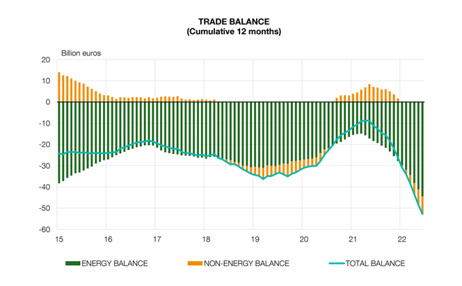 En el sector exterior, el deterioro de la balanza comercial es intenso, impulsado por el mayor valor de las importaciones energéticas -tanto por su mayor precio como por la depreciación del euro-.
