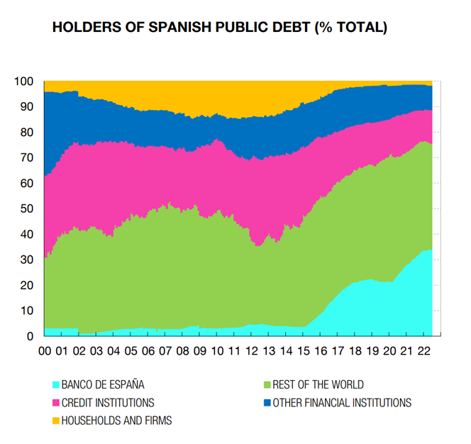 De hecho, se observa cómo cada vez la deuda española es más dependiente de la deuda que compre el BCE (a través del Banco de España), ya que acumula mayor porcentaje en los últimos años.