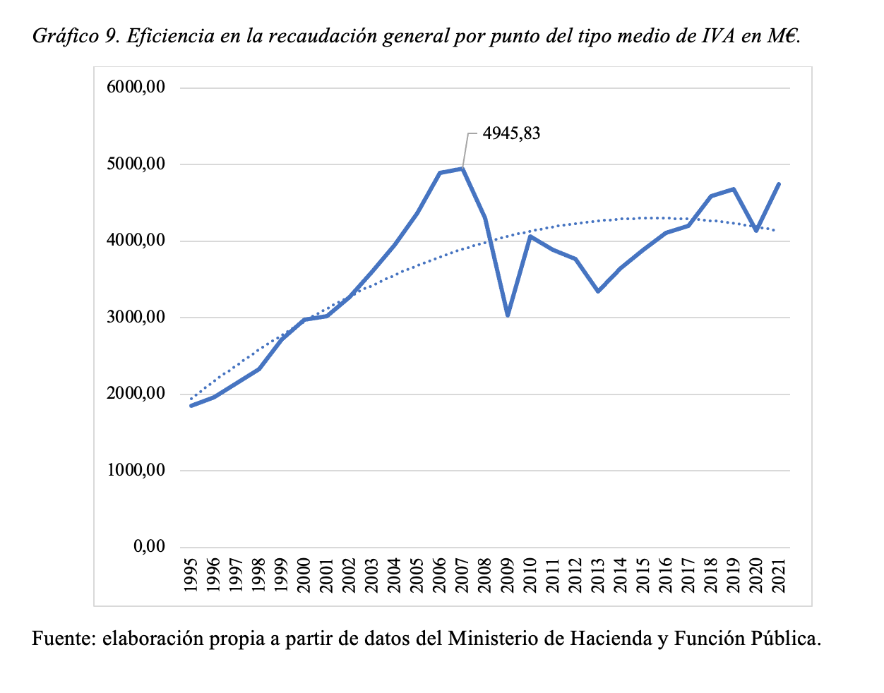 En términos cronológicos, la investigación de Fernando Pinto pone de manifiesto que la eficiencia recaudatoria empieza a perderse en torno a 2007 y, desde entonces, describe una curva cada vez menos dinámica. En su punto álgido, el sistema tributario fue capaz general 13.989 millones por cada punto de aumento en el tipo medio de los gravámenes aplicados… pero esa rúbrica ha llegado a caer hasta los 11.000 millones y, en los últimos años, solo se ha corregido al alza a base de aplicar fortísimos aumentos impositivos, como está haciendo el Ejecutivo de Pedro Sánchez. Según la investigación, esto pondría de manifiesto que "no por incrementar los impuestos se obtienen mayores niveles de ingresos en el futuro".