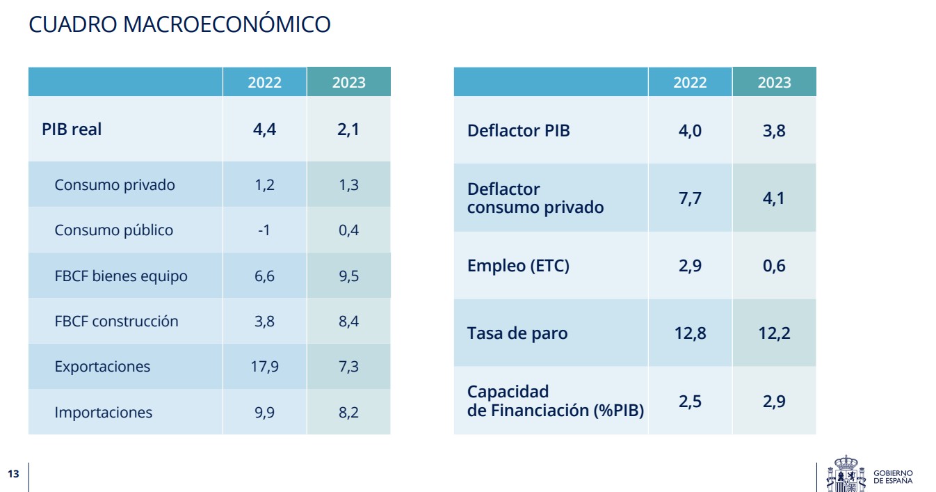 Aunque el Gobierno no ofrece previsiones del índice de precios de consumo (IPC), sí lo hace del deflactor del consumo privado, un indicador similar al IPC que el Gobierno sitúa en el 4,1% en 2023, también significativamente por debajo de los números del Banco de España. A continuación, el dudoso cuadro macro del Gobierno.