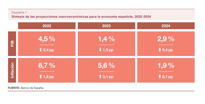 Para 2023, el ala económica del Ejecutivo estima que la economía española crecerá el 2,1% (ha tenido que revisarlo desde el 2,7%), una cifra que está muy lejos de la del Banco de España, que cree que el PIB apenas subirá un 1,4%, según esta última revisión. "El crecimiento proyectado para 2023 es 1,5 puntos porcentuales menor que el que se contemplaba en el anterior ejercicio de previsiones, debido, entre otros factores, a las mayores tasas de inflación proyectadas, a unas condiciones de financiación menos favorables, al aumento de la incertidumbre y al debilitamiento de la demanda global" señala el organismo.