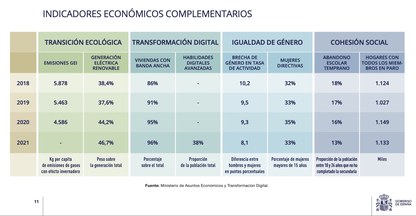 El tercero de los indicadores, el de transformación digital muestra un nivel del 38% en "habilidades digitales avanzadas", pero no muestra ninguna cifra previa con la que compararla. Curiosa manera de analizar el avance. El cuarto, el de igualdad de género, marca un porcentaje de "mujeres directivas" del 33%. Y es el mismo que había en 2019. Y el quinto, el de cohesión social, admite que hay 1,13 millones de hogares con todos sus miembros en paro, más que los 1,02 millones de 2019 y hasta que los 1,12 millones de 2018.