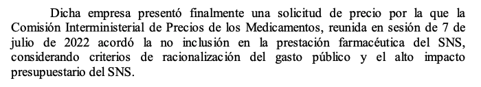 En la imagen se extrae el párrafo en el que el Gobierno justifica la no financiación del medicamento. Se trata del medicamento Trodelvy 200 mg polvo para concentrado para perfusión, que ha demostrado efectividad en la lucha contra uno de los cánceres de mama más agresivos, concretamente el cáncer de mama triple negativo localmente recurrente irresecable o metastásico.
