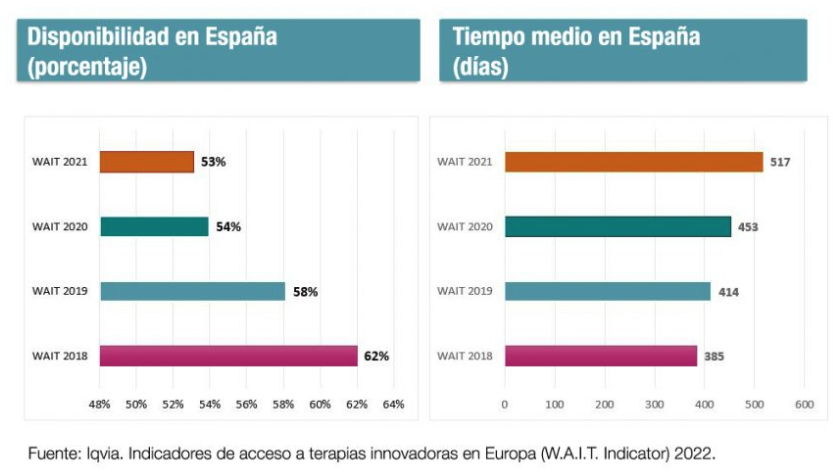 Según el informe anual de indicadores de acceso a terapias innovadoras en Europa (W.A.I.T. Indicator) elaborado por la consultora Iqvia para la Federación de Asociaciones de la Industria Farmacéutica (EFPIA) analiza las autorizaciones de la Agencia Española del Medicamento entre 2017 y 2020 y el tiempo medio que transcurre desde que un nuevo medicamento es aprobado por las autoridades europeas hasta que está disponible para su uso en distintos países europeos. En España, a finales de 2021 el retraso es de 517 días, más de 17 meses de demora. En Alemania el tiempo de demora es de 133 días, en Francia de 240 o en Inglaterra de 340.