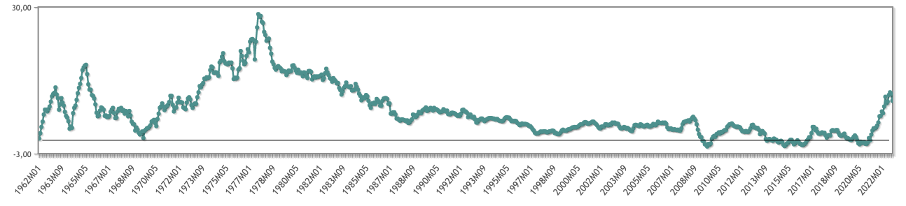 Y esa fue la anterior vez que vimos sobrepasar esa tasa. En 1970 la inflación alcanzó el 5,7% y comenzó una escalada brutal de precios que mantuvo el indicador en "inflación desbocada" (por encima del 10%) durante 12 años, llegando al máximo en 1977 cuando alcanzó el 24,54%.