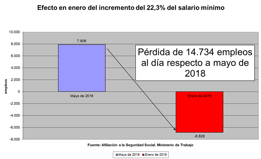 En 2019, decidió elevarlo un 22,3%, desde los 735,90 euros hasta los 900 euros. ¿Cuál fue el resultado inmediato? Una destrucción de empleo en ese mes de enero de más de 200.000 puestos de trabajo, como reflejó la afiliación a la Seguridad Social del mes de enero de 2019. Eso llevó a que si antes de llegar Sánchez al Gobierno se creaban 7.906 empleos al día, el primer mes en el que tuvo efecto la subida del salario mínimo un 22,3% se destruyeron 6.828 empleos al día, es decir, hubo una pérdida de empleos diaria de 14.734 puestos de trabajo.