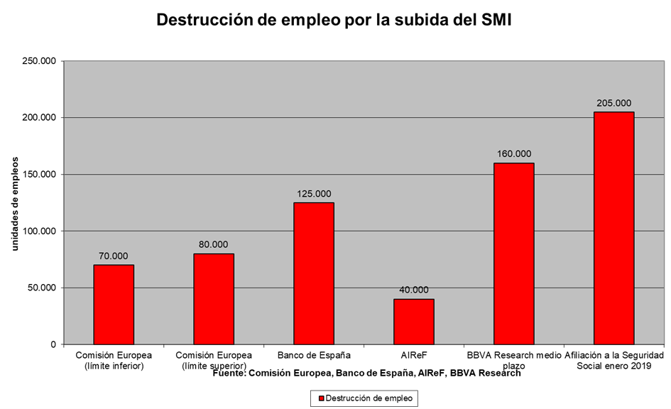 De hecho, junto a esa pérdida de aquel mes, aunque luego se ajustasen empleos al pasar la estacionalidad, todas las instituciones de previsión estimaron un duro impacto de la subida del salario mínimo en la destrucción de empleo: de los 70.000 de la Comisión Europea hasta los 160.000 de BBVA.