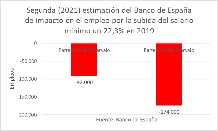 Y a mediados del año pasado, 2021, el mismo Banco de España estimó que el impacto fue mucho más negativo, con una merma del empleo debido al incremento del salario mínimo en 2019 de entre 92.000 y 174.000 puestos de trabajo.