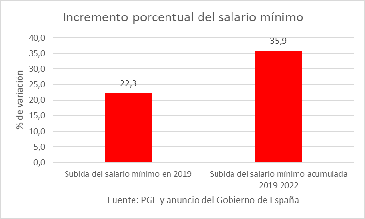 No contento con eso, el Gobierno volvió a subir el salario mínimo en 2020, hasta 950 euros mensuales; a los que hubo que añadir 15 euros más en 2021. En esa insistencia en su equivocación, el Ejecutivo elevó a 1.000 euros el salario mínimo en 2022, de manera que hemos pasado en tres años de un salario mínimo de 735,90 euros a otro de 1.000 euros, con un incremento acumulado del 35,89%.