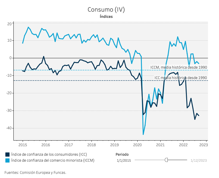 En lo que se refiere al consumo, las caídas son más pronunciadas. En el caso del índice de confianza del consumidor que ofrece Funcas con fuentes de la Comisión Europea cae notablemente por debajo de lo registrado durante la pandemia. Se desploma un 32,9%.