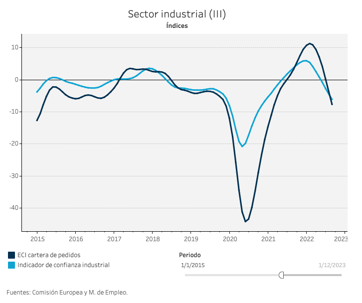 Otro de los indicadores que invitan al pesimismo es el que avanza la profunda crisis que se avecina en la industria nacional. La cartera de pedios industriales caía en septiembre un 7,74%, mientras el indicador de confianza industrial también sufre una fuerte corrección a la baja del 6,17%.