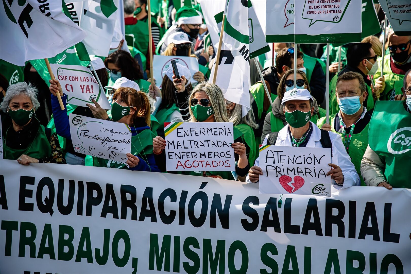 El sindicato encargado de coger este testigo ha sido la Central Sindical Independiente y de Funcionarios (CSIF), organización más representativa en las administraciones públicas y con presencia creciente en el sector privado, que ha exigido al Ministerio de Sanidad la equiparación y subida de retribuciones, regulación de trienios y posibilidad de una carrera profesional para todos los trabajadores fijos e interinos "en todos los servicios de Sistema Nacional de Salud (SNS)". El sindicato ya ha trasladado, además, esta petición a la Mesa de Negociación del Ámbito de la Sanidad, es decir, que el Gobierno ya está al corriente de esta exigencia.