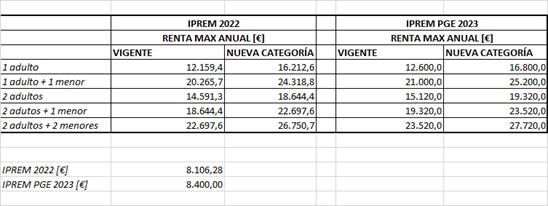 Y en cuanto a la factura de la luz, se contempla una reducción del 40% sobre la tarifa eléctrica regulada (PVPC) para los "hogares trabajadores con bajos ingresos", pudiéndose beneficiar todos los hogares cuya renta se sitúe entre 1,5 y dos veces el Indicador Público de Renta de Efectos Múltiples (IPREM) de 14 pagas. Esta actualización del IPREM, concretada en la siguiente tabla, llevará, según el Ejecutivo, a que las familias beneficiadas de la tarifa regulada aumenten en un millón y medio.
