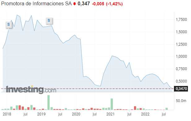Al cierre del mercado de este lunes Prisa marcaba nuevos mínimos después de que se conociera que el holding tendrá que acometer una nueva ampliación de capital para poder refinanciar su deuda, una deuda que cada día se adivina más inmanejable. Y el fuerte desplome de la compañía así lo atestigua. En primavera de 2019 las acciones de Prisa se cambiaban a 1,70 euros. Ahora apenas cuestan 34 céntimos.