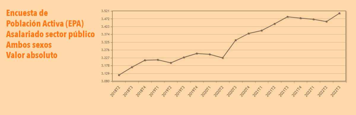 Uno de los datos más preocupantes entre los que hemos conocido hoy es el aumento sistemático del empleo público de los últimos trimestres. Tanto está engordando el número de funcionarios a sueldo de todo tipo de Administraciones, que la EPA revela que España ha roto la escalofriante barrera de los 3,5 millones de empleados públicos entre junio y septiembre.
