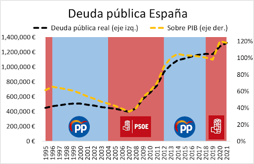 En el primer artículo de esta serie argumentábamos que España tiene un déficit público sobre PIB que parece completamente incurable. En el segundo artículo utilizamos un indicador alternativo, el déficit sobre ingreso fiscal para llegar a la misma conclusión: La irresponsabilidad fiscal hizo su aparición en el año 2007 y parece que vino para quedarse. En este tercer artículo de la serie vamos a analizar el nivel de deuda pública española desde el año 1995 hasta la actualidad bajo diferentes gobiernos. Como no puede ser de otra forma, un déficit público crónico cristaliza en una deuda pública demasiado elevada. La pregunta del millón es: ¿cómo de elevada?, ¿se pueden encontrar las cuentas públicas de España en problemas derivados de la irresponsabilidad política instalada en el poder desde el año 2007?
